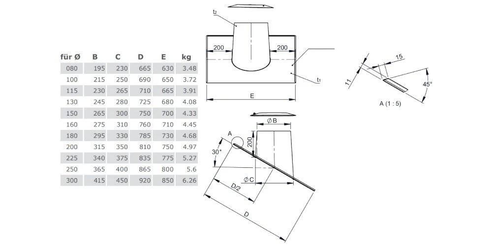 | Innendurchmesser (Schornstein) | Schellengröße/Außen-Ø (Innen-Ø + 65 mm) |