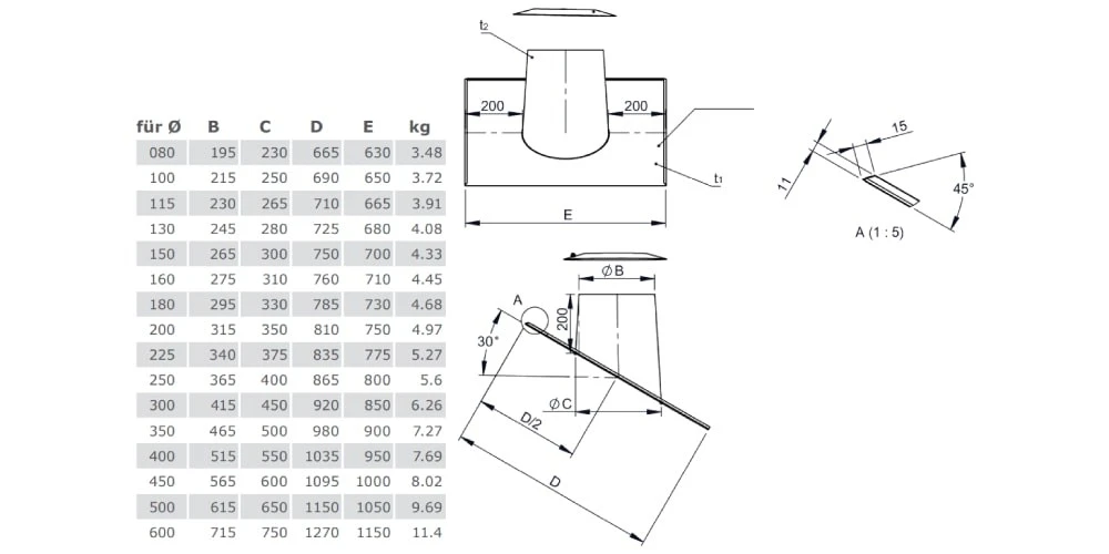 | Innendurchmesser (Schornstein) | Schellengröße/Außen-Ø (Innen-Ø + 65 mm) |