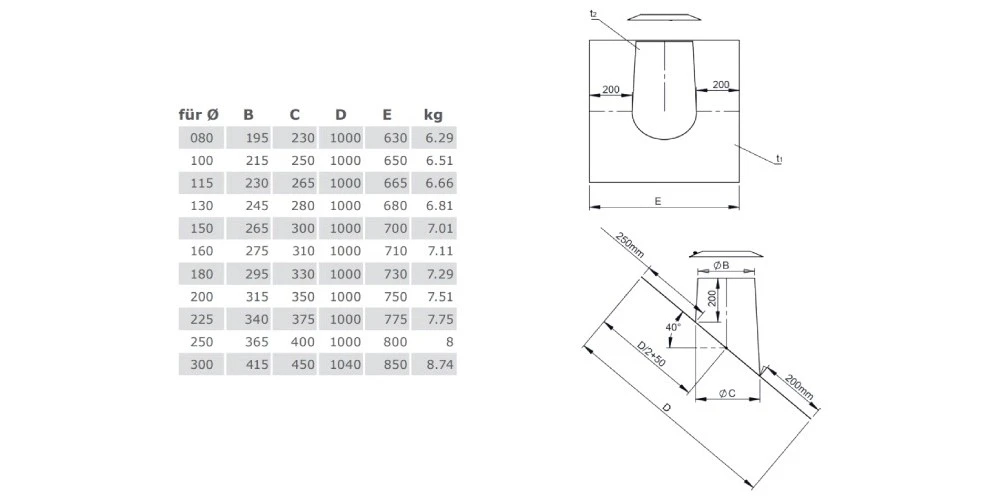 | Innendurchmesser (Schornstein) | Schellengröße/Außen-Ø (Innen-Ø + 65 mm) |