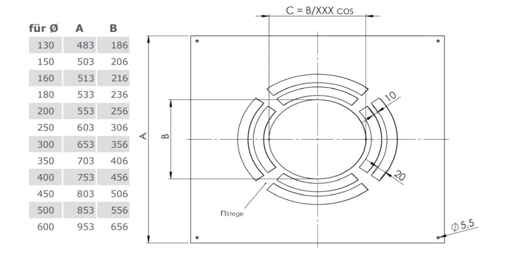 Deckenblende mit Schlitzen für eine gute Hinterlüftung von Edelstahlschornsteinen.