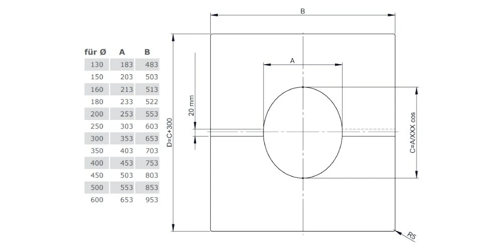 Deckenblende in geneigter Ausführung für Edelstahlschornsteine.