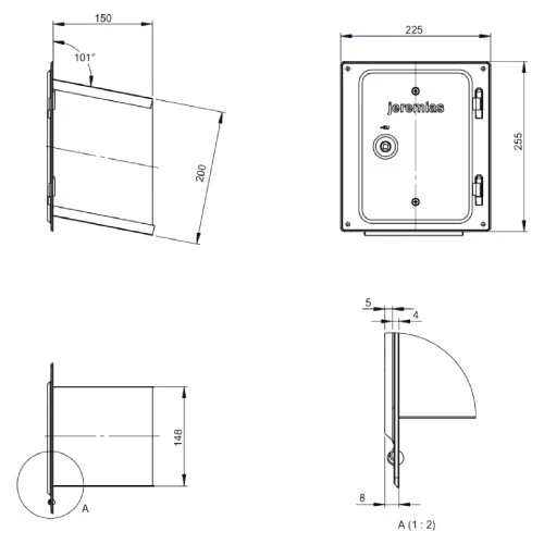 1x Edelstahlkamintüre 210 x 140 mm mit Schiebestutzen 150 mm schräg, inkl. Kamintürenschlüssel, passend für FU07K für System EW-FU von Jeremias