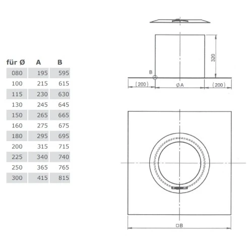 | Innendurchmesser (Schornstein) | Schellengröße/Außen-Ø (Innen-Ø + 65 mm) |