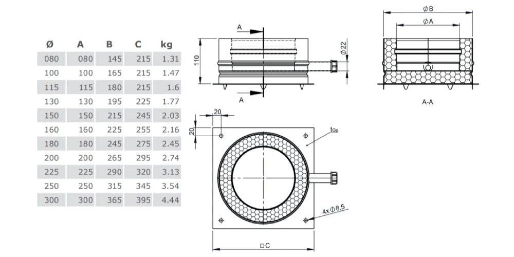 Oft kann ein Edelstahlschornstein nur auf dem Boden aufgestellt werden. Es wird eine sehr stabile Grundplatte benötigt. Die Grundplatte für Sockelmontage ist hervorragend für die Bodenmontage von Edelstahlschornsteinen geeignet.