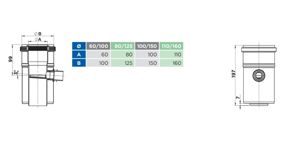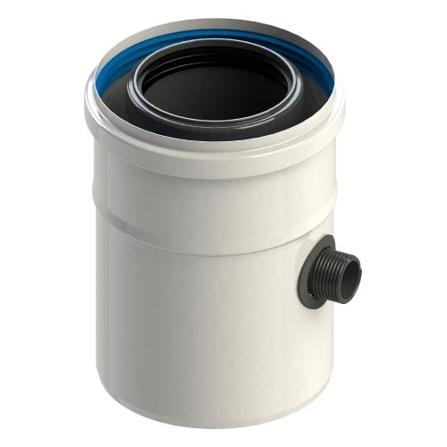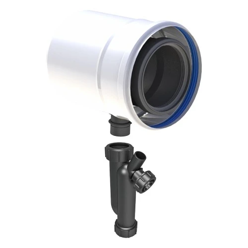 Kondensatablauffalle inkl. Siphon für hotizontalen Einbau. Konzentrische Verbindungsleitung für Feuerstätten in raumluftunabhängiger Betriebsweise. Einbau nur im Gebäude, als Verbindungsleitung zur senkrechten Abgasführung.