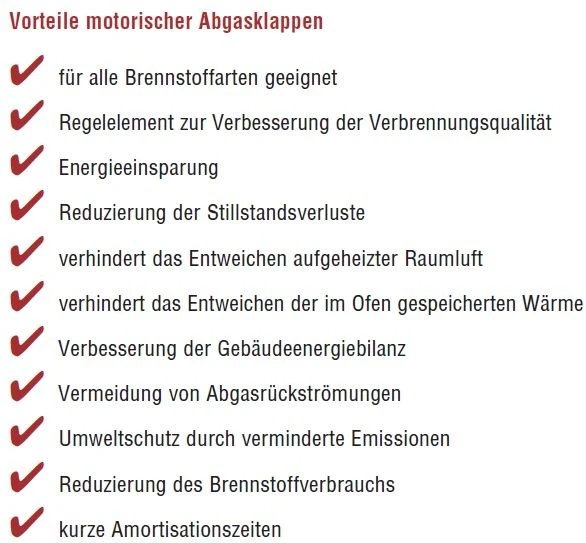 Abgasklappen, auch Diermayerklappen genannt, verhindern das Abströmen der Restwärme aus der Feuerstätte über den Schornstein und damit das schnellere Abkühlen des beheizten Raumes. Dadurch werden die Stillstandsverluste von Gasfeuerstätten vermindert und die Energiebilanz des Gebäudes positiv beeinflusst. Abgasklappen bzw. Diermayerklappen gibt es in der Ausführung als thermisch gesteuerte Abgasklappe oder als motorisch gesteuerte Abgasklappe. Das Absperrelement, also die verschließende Klappe der Abgasklappen, wird bei den thermischen Abgasklappen von mindestens zwei unabhängig arbeitenden Steuerorganen aus Thermobimetall besteuert. Das Thermobimetall beginnt ab ca. 40 °C Abgastemperatur die Klappe selbstständig zu öffnen. Fällt die Abgastemperatur unter diesen Wert, also wenn der Gasofen abgeschaltet wird, schließt sich die Abgasklappe wieder selbstständig. Die Abgasklappen/Diermayerklappen von Kutzner & Weber (K&W) sind für alle Gasfeuerstätten der Bauart B11 geeignet. Das Absperrelement, also die verschließende Klappe der Abgasklappen, wird bei den motorischen Abgasklappen per Stellmotor gesteuert. Neben den Funktionen wie bei den thermischen Abgasklappen beschrieben, bieten diese Abgasklappen zusätzlich einen effektiven Schutz um das Zurückströmen von Abgasen bei Mehrfachbelegung (Kaskadenbetrieb) über Geräte, welche nicht in Betrieb sind, zu verhindern. Da immer häufiger mehrfachbelegte Heizanlagen abgasseitig im Überdruckbereich betrieben werden, müssen Rückstromsicherungen (Abgasklappen) eingebaut werden.