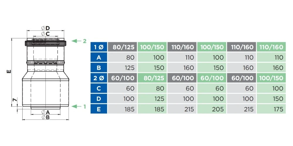 Reduzierung konzentrisch. Konzentrische Verbindungsleitung für Feuerstätten in raumluftunabhängiger Betriebsweise. Einbau nur im Gebäude, als Verbindungsleitung zur senkrechten Abgasführung.