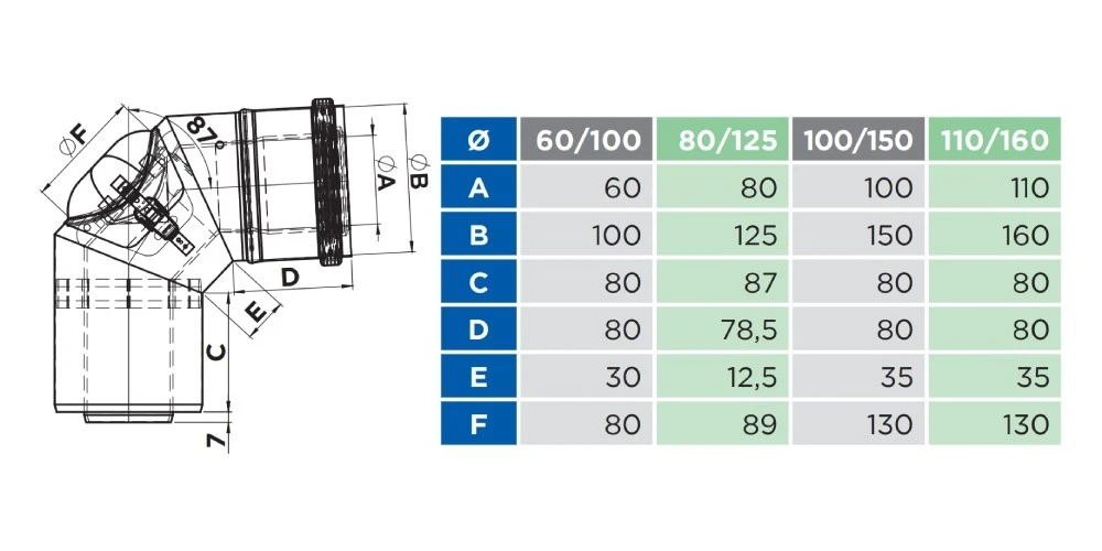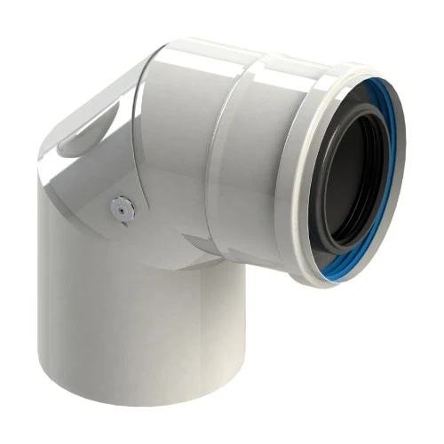Reinigungswinkel 87°. Konzentrische Verbindungsleitung für Feuerstätten in raumluftunabhängiger Betriebsweise. Einbau nur im Gebäude, als Verbindungsleitung zur senkrechten Abgasführung.