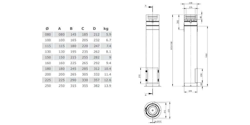 Für die Bodenmontage von doppelwandigen Kupferschornsteinen. Separate Tür für die Unterbringung von Kondensatablaufbehältern. Eine sehr saubere Lösung für die Kondensatabführung im Bereich der Kupferschornsteine.