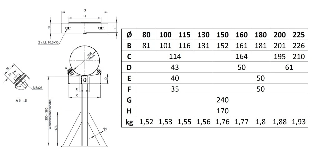 Für eine einfache und verstellbare Wandmontage. Der Schornstein kann millimetergenau montiert werden.
