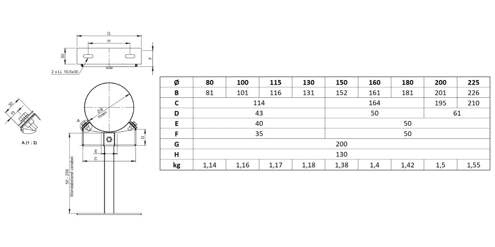 1 x Wandabstandshalter verstellbar 50 – 250 mm für Jeremias DW-FU und DW-Silver
