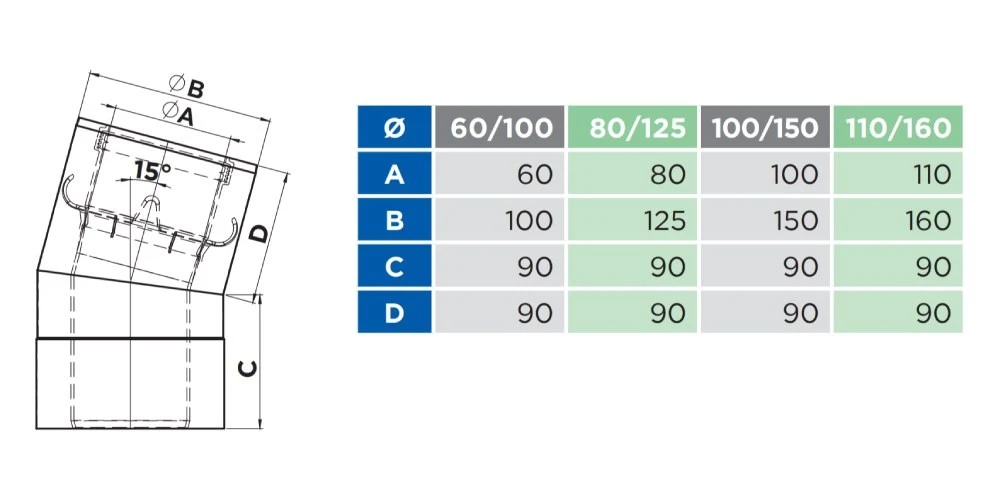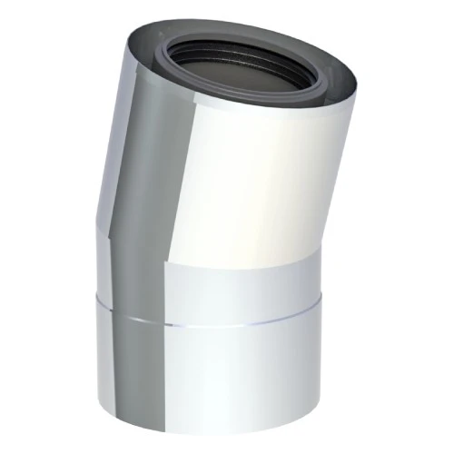 Winkel 15° starr. Konzentrische Systemabgasleitung (Außenrohr Edelstahl / Innenrohr Kunststoff) für Feuerstätten in raumluftunabhängiger Betriebsweise.