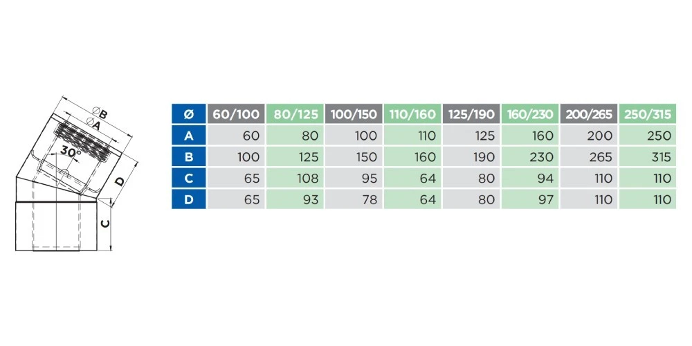 Winkel 30° starr. Konzentrische Systemabgasleitung (Außenrohr Edelstahl / Innenrohr Kunststoff) für Feuerstätten in raumluftunabhängiger Betriebsweise.