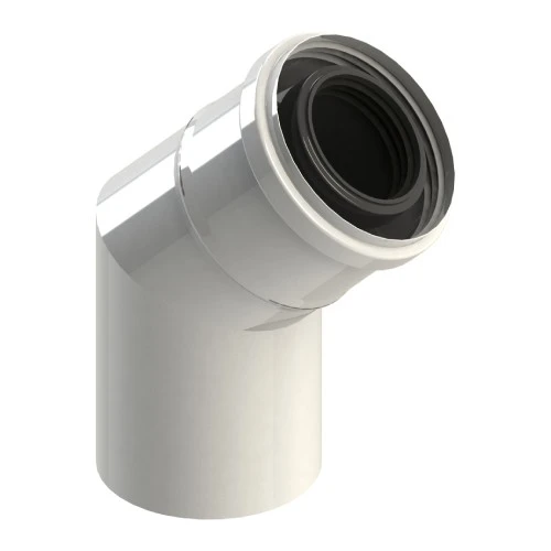 Winkel 45°. Konzentrische Verbindungsleitung für Feuerstätten in raumluftunabhängiger Betriebsweise. Einbau nur im Gebäude, als Verbindungsleitung zur senkrechten Abgasführung.