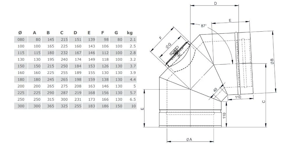 1x Winkel 87° mit Revisionsöffnung für Festbrennstoffe – doppelwandig für System DW-FU von Jeremias
