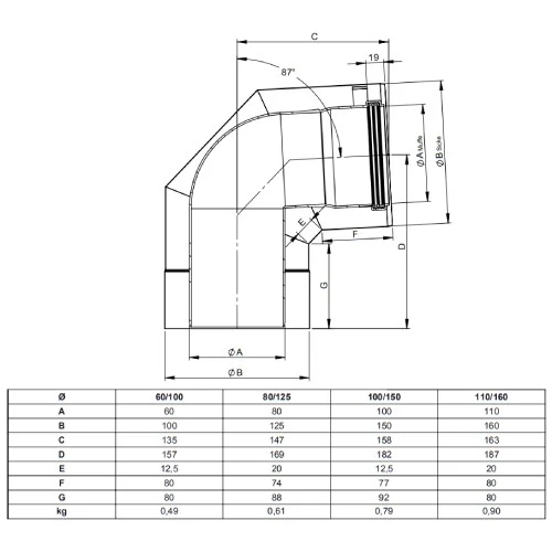 Winkel 87° starr. Konzentrische Systemabgasleitung (Außenrohr Edelstahl / Innenrohr Kunststoff) für Feuerstätten in raumluftunabhängiger Betriebsweise.