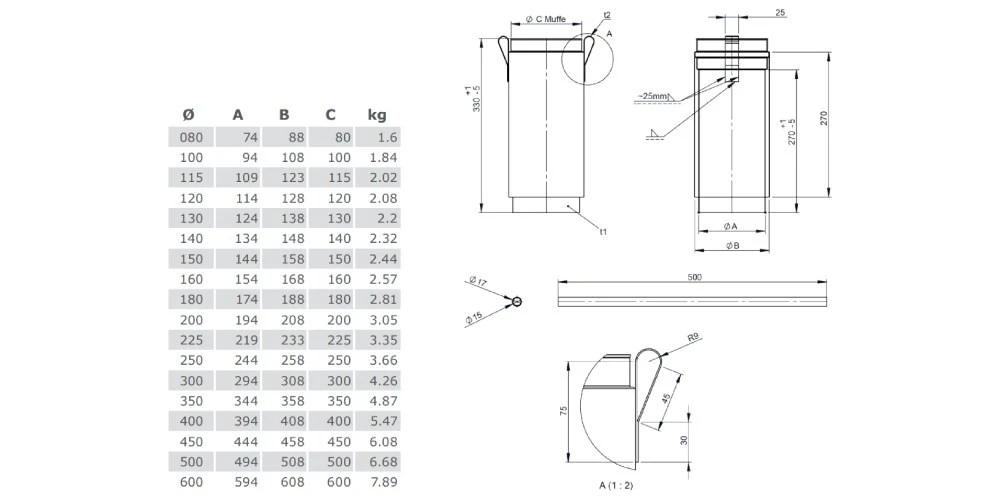 Schornsteinverlängerung – Doppelwandig – 500 Mm Wirksame Höhe